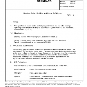 This specification covers sealed, self-aligning, anti-friction, rod end roller bearings operating in the temperature range of −65 to +300 °F (−54 to +149 °C) and intermittent spikes to 350 °F (177 °C).