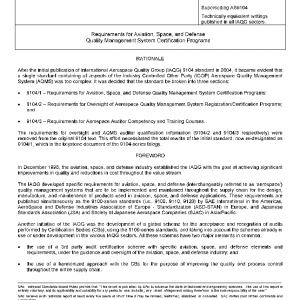 The AQMS standard adopted by the organization shall be 9100, 9110, and/or 9120, as appropriate to the organization’s activities; these standards are referred to throughout this writing as ‘AQMS standards’. IAQG member companies have committed to recognize the certification of a supplier’s quality management system to all equivalent AQMS standards (e.g., AS, EN, JISQ, NBR). IAQG sectors may expand the application of the requirements defined in this standard for other standards approved by the IAQG and its three sectors [i.e., Americas Aerospace Quality Group (AAQG), European Aerospace Quality Group (EAQG), Asia/Pacific Aerospace Quality Group (APAQG)].