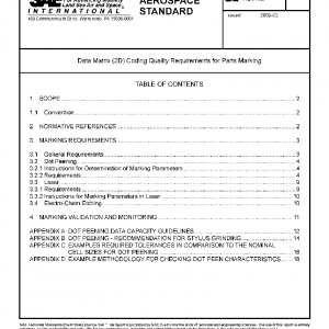 This Standard defines uniform Quality and Technical requirements relative to metallic parts marking performed in using “Data Matrix symbology” (2D) coding used within the aerospace industry. The ISO 16022 specifies general requirements (data characters encodation, error correction rules, decoding algorithm, etc.). In addition to this specification, part Identification with such coding is subject to the following requirements to ensure electronic reading (scanning) ability of the symbol.
