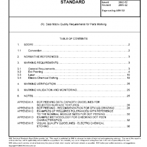 This SAE Aerospace Standard (AS) defines uniform Quality and Technical requirements relative to metallic parts marking performed in using “Data Matrix symbology” used within the aerospace industry. The ISO/IEC 16022 specifies general requirements (data character encodation, error correction rules, decoding algorithm, etc.). In addition to ISO/IEC 16022 specification, part identification with such symbology is subject to the following requirements to ensure electronic reading of the symbol.