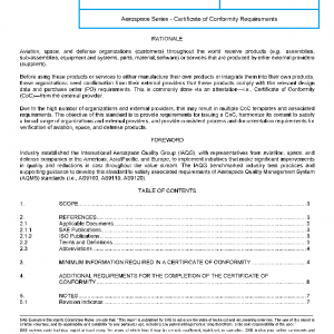This SAE Aerospace Standard (AS) provides a harmonized process and documentation requirements for the establishment of CoCs used to attest the conformity of aviation, space, and defense products (e.g., assemblies, sub-assemblies, equipment and systems, parts, material, software) or services. It includes a CoC template and supporting instructions on how to complete it.