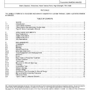 This SAE Aerospace Standard (AS) covers high strength thin wall (commercial) metric sockets, universal metric sockets, metric box wrenches and metric torque adaptors which possess the strength, clearances, and internal wrenching design so configured that, when mated with 12 point fasteners conforming to the requirement of ISO 4095, they shall transmit torque to the fastener without bearing on the outer 5% of the fastener’s wrenching points. This standard provides additional requirements beyond ASME B107.100 and B107.5M appropriate for aerospace use.
