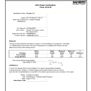 J1349 Certified Power Engine Data for Dodge Pentastar 3.6L DOHC V6 as used in 2011 Dodge Challenger – Level 2