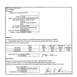 J1349 Certified Power Engine Data for 5.7L V8 as used in 2009 MY Dodge Challenger ATX, 2009 MY Dodge Charger Daytona, 2009 MY Dodge Charger R/T AWT – Level 2