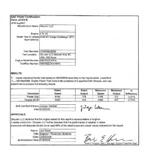 J1349 Certified Power Engine Data for 5.7 L V8 as used in 2009 MY Dodge Challenger MTX – Level 2