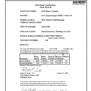 J1349 Certified Power Engine Data for Ford 5.4L as used in 2010 Shelby GT500 Mustang – Level 1