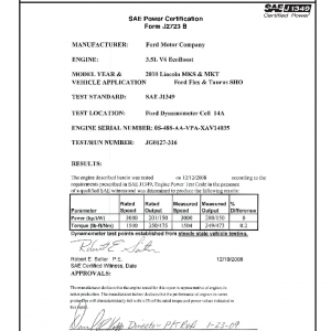 J1349 Certified Power Engine Data for Ford as used in 2010 Lincoln MKS & MKT Ford Flex & Taurus SHO – Level 1