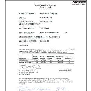 J1349 Certified Power Engine Data for 6.2L SOHC V8 as used in 2011 Ford F150 – Level 1