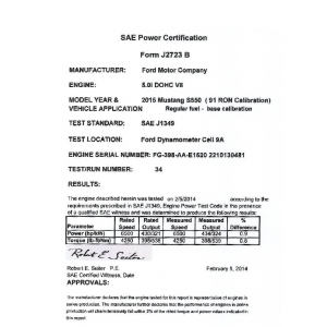 J1349 Certified Power Engine Data for Ford 5.0L DOHC V8 as used in 2015 Mustang – 91 RON Calibration (Level 1)