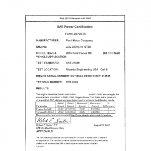 J1349 Certified Power Engine Data for Ford as used in 2016 Ford Focus RS – Steady State – Level 1