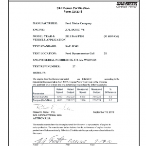 J1349 Certified Power Engine Data for Ford 3.7L DOHC V6 as used in 2011 Ford 150 (91 RON Cal) – Level 2
