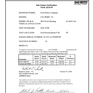 J1349 Certified Power Engine Data for Ford 3.7L DOHC V6 (91RON Calibration) as used in 2011 Ford Mustang – Level 2