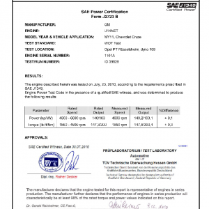 J1349 Certified Power Engine Data for GM U14NET as used in 2011 Chevrolet Cruze – Level 1