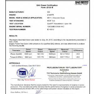 J1349 Certified Power Engine Data for GM U18XFR as used in 2011 Chevrolet Cruze – Level 1