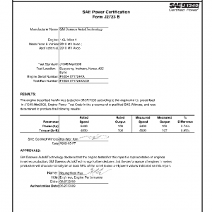 J1349 Certified Power Engine Data for GM Daewoo 1.6L Inline 4 as used in 2010 MY Aveo – Level 1