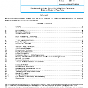 This standard defines the requirements for fully replacing undesirable surface finishes using robotic hot solder dip. Requirements for qualifying and testing the refinished piece parts are also included. This standard covers the replacement of pure tin and Pb-free tin alloy finishes with SnPb finishes with the intent of subsequent assembly with SnPb solder. This dipping is different from dipping to within some distance of the body for the purposes of solderability; solder dipping for purposes other than full replacement of pure tin and Pb-free tin alloy finishes are beyond the scope of this document. It covers process and testing requirements for robotic dipping process and does not cover semi-automatic or purely manual dipping processes.