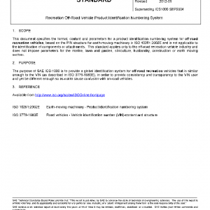 This document specifies the format, content and parameters for a product identification numbering system for off-road recreation vehicles, based on the PIN structure for earth-moving machinery in ISO 10261:2002E and is not applicable to the identification of components or attachments. This standard applies only to the off-road recreation vehicle industry and does not impose parameters for the marine, lawn and garden, silviculture, husbandry, construction or earth moving sectors.