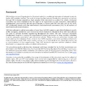 This document specifies engineering requirements for cybersecurity risk management regarding concept, product development, production, operation, maintenance and decommissioning of electrical and electronic (E/E) systems in road vehicles, including their components and interfaces.A framework is defined that includes requirements for cybersecurity processes and a common language for communicating and managing cybersecurity risk.This document is applicable to series production road vehicle E/E systems, including their components and interfaces, whose development or modification began after the publication of this document.This document does not prescribe specific technology or solutions related to cybersecurity.