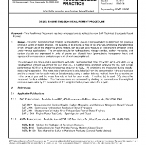 This SAE Recommended Practice is intended for use as a test procedure to determine the gaseous emission levels of diesel engines. Its purpose is to provide a map of an engine’s emissions characteristics which, through use of the proper weighting factors, can be used as a measure of that engine’s emission levels under various applications. The emission results for hydrocarbons, nitrogen oxides, carbon monoxide, and carbon dioxide are expressed in units of grams per kilowatt hour (grams/brake horsepower hour) and represent the mass rate of emissions per unit of work accomplished.