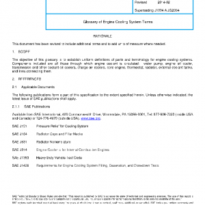 The objective of this glossary is to establish uniform definitions of parts and terminology for engine cooling systems. Components included are all those through which engine coolant is circulated: water pump, engine oil cooler, transmission and other coolant-oil coolers, charge air coolers, core engine, thermostat, radiator, external coolant tanks, and lines connecting them.