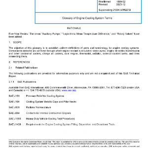 The objective of this glossary is to establish uniform definitions of parts and terminology for engine cooling systems. Components included are all those through which engine coolant is circulated: water pump, engine oil cooler, transmission and other coolant-oil coolers, charge air coolers, core engine, thermostat, radiator, external coolant tanks, and lines connecting them.