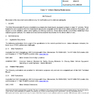 This SAE Recommended Practice establishes boundaries for shade bands on glazed surfaces in class “A” vehicles. These boundaries are located so that the shade band can provide occupant comfort and driver vision protection from glare, with respect to solar radiation, under some lighting and driving conditions. Since shade bands transmit less visible light than adjacent glazed surfaces, the shade band boundaries establish boundaries for the driver’s field of view.