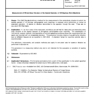 This SAE Standard defines a method for the measurement of the whole body vibration to which the seated operator of off-highway self-propelled work machines is exposed while performing an actual or simulated operation. It applies to vibration transmitted to the operator through the seat. There are not equivalent ISO Standards. In the main body of this document, conditions are defined for measuring and recording whole body vibration of the seated operator of off-highway self-propelled work machines. The specification of instruments, analytic methods, and description of site and operating conditions allows the measurements to be made and reported with an acceptable precision. The procedure includes means of weighing the vibration level at different frequencies as specified in ISO2631. A standard format for reporting spectral data is recommended. The definitions, instruments, and analytic methods also apply to simulated tests for operator vibration as performed in laboratories. This procedure is a measuring method only and is not intended for the evaluation or selection of seating systems.