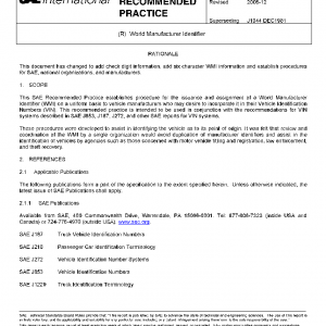 This SAE Recommended Practice establishes procedure for the issuance and assignment of a World Manufacturer Identifier (WMI) on a uniform basis to vehicle manufacturers who may desire to incorporate it in their Vehicle Identification Numbers (VIN). This recommended practice is intended to be used in conjunction with the recommendations for VIN systems described in SAE J853, J187, J272, and other SAE reports for VIN systems.