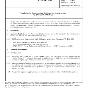 This SAE Standard provides a method to obtain consistent force-deflection data of finished (or unfinished, when specified) cushioned components of seats for off-road work machines as listed in SAE J1116. This data may be helpful in maintaining seat comfort characteristics and quality control. There is no intent to establish any acceptance criteria.