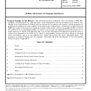 This SAE Recommended Practice describes head position contours and procedures for locating the contours in a vehicle. Head position contours are useful in establishing accommodation requirements for head space and are required for several measures defined in SAE J1100. Separate contours are defined depending on occupant seat location and the desired percentage (95 and 99) of occupant accommodation.