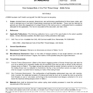 Included herein are general, dimensional, and performance specifications for those types, styles, and sizes of stamped nuts of one pitch thread design recognized as SAE standard. These nuts are intended for general use where the engagement of a single thread on the mating screw or unthreaded stud is considered adequate for the application. For the inch equivalent of this document, see SAE J1053.