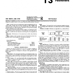 Included herein are complete general and dimensional data for the various types of square and hex bolts recognized as SAE Standard and commonly used in automotive and other ground based motor vehicles and industrial equipment. Also included are appendixes covering wrench openings for bolts and thread runout sleeve gages. The inclusion of dimensional data in this standard is not intended to imply that all of the products described are stock production sizes. Users are requested to consult with manufacturers concerning lists of stock production sizes.