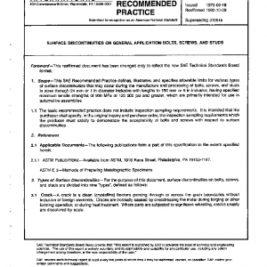This SAE Recommended Practice defines, illustrates, and specifies allowable limits for various types of surface discontinuities that may occur during the manufacture and processing of bolts, screws, and studs in sizes through 24 mm or 1 in diameter inclusive with lengths to 150 mm or 6 in inclusive, having specified minimum tensile strengths of 900 MPa or 120 000 psi and greater, which are primarily intended for use in automotive assemblies.