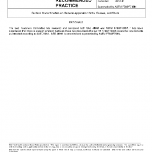 This SAE Recommended Practice defines, illustrates, and specifies allowable limits for various types of surface discontinuities that may occur during the manufacture and processing of bolts, screws, and studs in sizes through 24 mm or 1 in diameter inclusive with lengths to 150 mm or 6 in inclusive, having specified minimum tensile strengths of 900 MPa or 120 000 psi and greater, which are primarily intended for use in automotive assemblies.