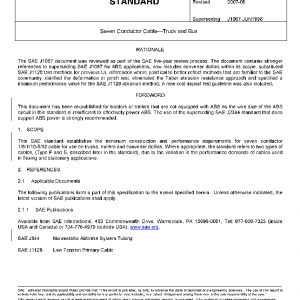 This SAE standard establishes the minimum construction and performance requirements for seven conductor 1/8-1/10-5/12 cable for use on trucks, trailers and converter dollies. Where appropriate, the standard refers to two types of cables, (Type F and S, described later in the standard), due to the variation in the performance demands of cables used in flexing and stationary applications.