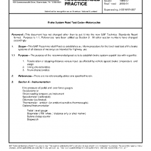 This SAE Recommended Practice establishes a uniform procedure for the level road test of the brake systems of all classes of motorcycles intended for highway use.