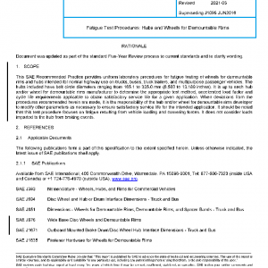 This SAE Recommended Practice provides uniform laboratory procedures for fatigue testing of wheels for demountable rims and hubs intended for normal highway use on trucks, buses, truck trailers, and multipurpose passenger vehicles. The hubs included have bolt circle diameters ranging from 165.1 to 335.0 mm (6.500 to 13.189 inches). It is up to each hub and/or wheel for demountable rims manufacturer to determine the appropriate test method, accelerated load factor and cycle life requirements applicable to obtain satisfactory service life for a given application. When deviations from the procedures recommended herein are made, it is the responsibility of the hub and/or wheel for demountable rims developer to modify other parameters as necessary to ensure satisfactory service life for the intended application. It should be noted that this test procedure focuses on fatigue resulting from vehicle loading and cornering forces. It does not consider loads imparted to the hub from braking events.
