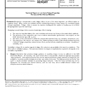 Information that provides design guidance in avoiding fatigue failures is outlined in this SAE Information Report. Of necessity, this report is brief, but it does provide a basis for approaching complex fatigue problems. Information presented here can be used in preliminary design estimates of fatigue life, the selection of materials and the analysis of service load and/or strain data. The data presented are for the “low cycle” or strain-controlled methods for predicting fatigue behavior. Note that these methods may not be appropriate for materials with internal defects, such as cast irons, which exhibit different tension and compression stress-strain behavior.