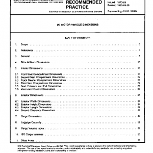 This SAE Recommended Practice defines a uniform set of interior and exterior dimensions for passenger cars, multipurpose passenger vehicles, and trucks.