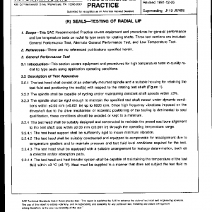 This SAE Recommended Practice covers equipment and procedures for general performance and low temperature tests on radial lip type seals for rotating shafts. Three test sections are included: General Performance Test, Alternate General Performance Test, and Low Temperature Test.