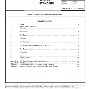 This SAE Standard defines methods and apparatus to evaluate electronic devices for immunity to potential interference from conducted transients along battery feed or switched ignition inputs. Test apparatus specifications outlined in this procedure were developed for component installed in vehicles with 12 V systems (passenger cars and light trucks, 12 V heavy-duty trucks, and vehicles with 24 V systems). Presently, it is not intended for use on other input/output (I/O) lines of the device under test (DUT).