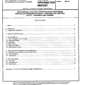 This part of SAE J1113 specifies test methods and procedures for testing electromagnetic immunity (of vehicle radiation sources) of electronic components for passenger cars and commercial vehicles. To perform this test method, the electronic module along with the wiring harness (prototype or standard test harness) and peripheral devices will be subjected to the electromagnetic disturbance generated inside an absorber-lined chamber. The electromagnetic disturbances considered in this part of SAE J1113 are limited to continuous narrowband electromagnetic fields.