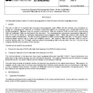 This part of SAE J1113 specifies the transverse electromagnetic mode (TEM) cell test methods and procedures for testing the electromagnetic immunity of electronic components (DUTs) for passenger cars, commercial vehicles and similar applications. Methods using the constant cross-section TEM cell (Crawford TEM) and the flared cross-section TEM cell (wideband TEM) are discussed in the document. The electromagnetic disturbance considered in this part of SAE J1113 will be limited to continuous narrowband electromagnetic fields. TEM cells produce both electric and magnetic fields simultaneously. The test is directly applicable to DUTs whose height is less than 1/3 the septum height; somewhat larger modules can be tested with conditions applied. The Crawford TEM and wideband TEM cell may be used for testing within the 1/3 height condition without demonstrating field uniformity within the cell, if the test set-up complies with the other provisions of this standard.