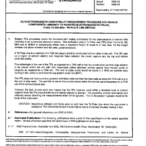This procedure covers the recommended testing techniques for the determination of electric field immunity of an automotive electronic device. This technique uses a Tri-Plate Line (TPL) from 10 kHz to 500 MHz and is limited to components which have a maximum height of equal to or less than 1/3 the height between the driven element and the outer, grounded plates.