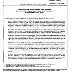 This SAE Standard contains limits1 and procedures for the measurement of radio disturbances in the frequency range of 150 kHz to 1000 MHz. The standard applies to any electronic/electrical component intended for use in vehicles and large devices. Refer to International Telecommunications Union (ITU) Publications for details of frequency allocations. The limits are intended to provide protection for receivers installed in a vehicle from disturbances produced by components/modules in the same vehicle.2