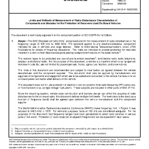 This SAE Standard contains limits1 and procedures for the measurement of radio disturbances in the frequency range of 150 kHz to 1000 MHz. The standard applies to any electronic/electrical component intended for use in vehicles and large devices. Refer to International Telecommunications Union (ITU) Publications for details of frequency allocations. The limits are intended to provide protection for receivers installed in a vehicle from disturbances produced by components/modules in the same vehicle.2