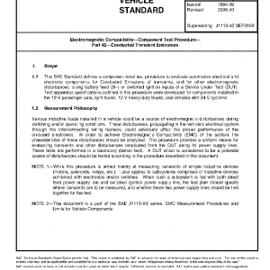 This SAE Standard defines a component-level test procedure to evaluate automotive electrical and electronic components for Conducted Emissions of transients, and for other electromagnetic disturbances, along battery feed (B+) or switched ignition inputs of a Device Under Test (DUT). Test apparatus specifications outlined in this procedure were developed for components installed in the 12-V passenger cars, light trucks, 12 V heavy-duty trucks, and vehicles with 24 V systems.