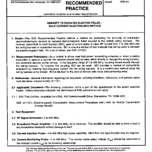 This SAE Recommended Practice defines a method for evaluating the immunity of automotive electrical/electronic devices to radiated electromagnetic fields coupled to the vehicle wiring harness. The method, called Bulk Current Injection (BCI), uses a current probe to inject RF current from 1 to 400 MHz into the wiring harness of automotive devices. BCI is one of a number of test methods that can be used to simulate the electromagnetic field. For a list of others, see SAE J1113/1.