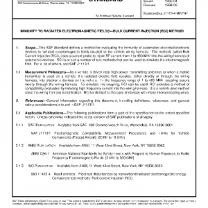 This SAE Standard defines a method for evaluating the immunity of automotive electrical/electronic devices to radiated electromagnetic fields coupled to the vehicle wiring harness. The method, called Bulk Current Injection (BCI), uses a current probe to inject RF current from 1 to 400 MHz into the wiring harness of automotive devices. BCI is one of a number of test methods that can be used to simulate the electromagnetic field. For a list of others, see SAE J1113/1.