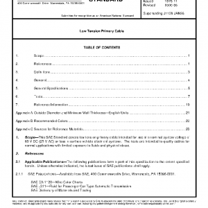 This SAE Standard covers low tension primary cable intended for use at a nominal system voltage of 60 V DC (25 V AC) or less in surface vehicle electrical systems. The tests are intended to qualify cables for normal applications with limited exposure to fluids and physical abuse.